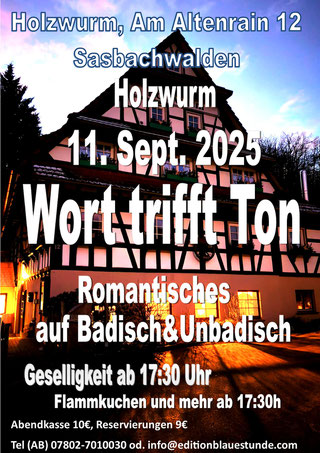 Ab September startet das AutorenNetzwerk wieder durch. Den Auftakt bildet die stimmungsvolle Veranstaltung „Wort trifft Ton – Romantisches auf Badisch & Unbadisch" am 11. September im Holzwurm Sasbachwalden. Bei elsässischem Flammkuchen ab 17:30 Uhr und literarisch-musikalischem Programm ab 19 Uhr verspricht der Abend Genuss für alle Sinne (Eintritt: 10 €, Anmeldung erbeten).